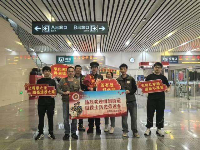 當(dāng)天,街道退役軍人服務(wù)中心工作人員早早守候在出站口,現(xiàn)場“熱烈歡迎退役士兵光榮返鄉(xiāng)”“榮歸南朗 再啟征程”等橫幅高懸,氣氛莊重而溫馨。當(dāng)身著戎裝、英姿颯爽的退役士兵陸續(xù)走出抵達(dá)通道,等候多時的工作人員與家屬立即上前,獻(xiàn)上鮮花、披上綬帶,用熱烈的掌聲和親切的問候迎接最可愛的人回家?!靶量嗔?!”“歡迎回家!”一句句暖心話語,驅(qū)散了旅途疲憊,更讓尊崇之光閃耀歸途。