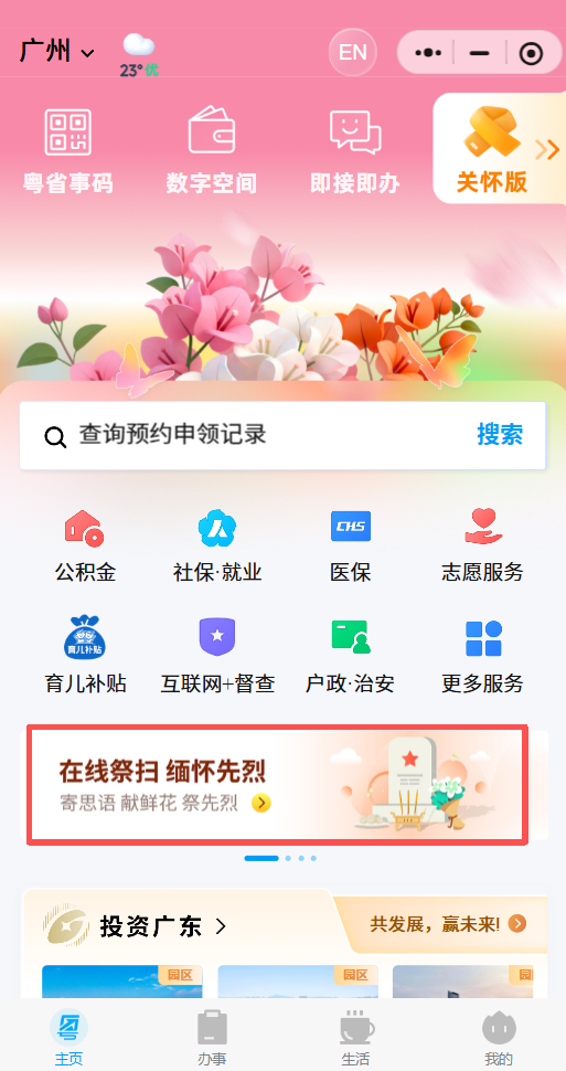 1、進(jìn)入粵省事后,在首頁(yè)往下滑動(dòng)至熱門服務(wù)下方的“推廣入口”區(qū)域,然后左右滑動(dòng),可見“在線祭掃 緬懷先烈”的圖片入口?;蛟谒阉鳈谳斎?strong>“英烈在線祭掃”進(jìn)入。