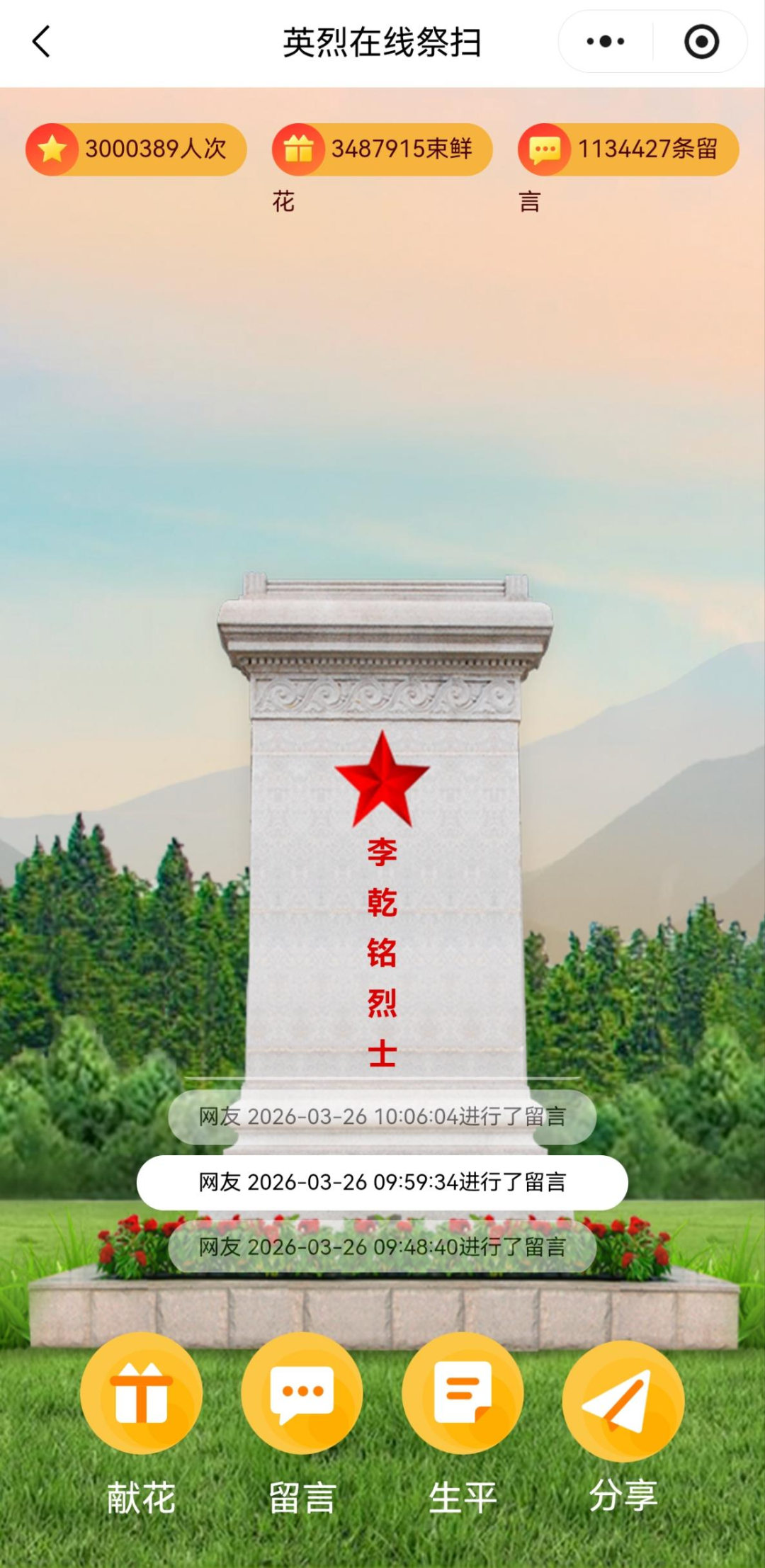 點(diǎn)擊【網(wǎng)上祭英烈】→選擇區(qū)域或英烈姓名,點(diǎn)擊【搜索】→查看英烈名錄,點(diǎn)擊英烈姓名進(jìn)行祭掃→點(diǎn)擊【生平】,可查看英烈生平及生前事跡→點(diǎn)擊【留言】,緬懷英烈→選擇【留名留言】或【不留名留言】→點(diǎn)擊【獻(xiàn)花】,可為英烈獻(xiàn)花。