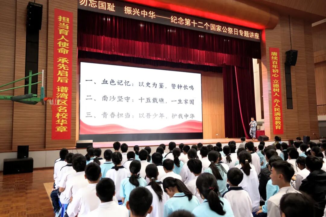活動邀請中山港口鎮(zhèn)人民武裝部副部長賀洪彪以《銘記歷史守海疆 青春立志報(bào)家國》為題開展專題講座,帶領(lǐng)師生重溫南京大屠殺那段山河破碎的屈辱歷史,闡釋國家公祭日的設(shè)立意義,讓師生深刻理解“銘記歷史、勿忘國恥”的意義?,F(xiàn)場莊嚴(yán)肅穆,全體師生為南京大屠殺死難同胞默哀,用無聲的敬意寄托對逝者的哀思。