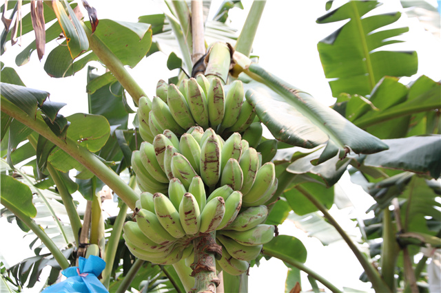 義倉(cāng)村擁有近400畝蕉林,品種以香蕉和蘋(píng)果蕉為主,蕉林大部分為本村人種植,約有120畝則承包給公司經(jīng)營(yíng),此次收割的蕉林是承包的,專(zhuān)門(mén)供給外地市場(chǎng)。沿著平坦的村道,大片蘋(píng)果蕉林分布在道路兩側(cè),只見(jiàn)成串的蘋(píng)果蕉被藍(lán)塑料袋和白紙帶包裹著,既用于防風(fēng)防蟲(chóng),又有利于蘋(píng)果蕉更好地著色。