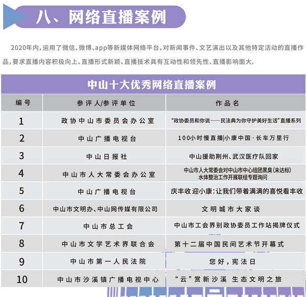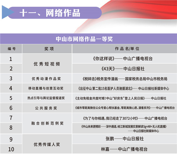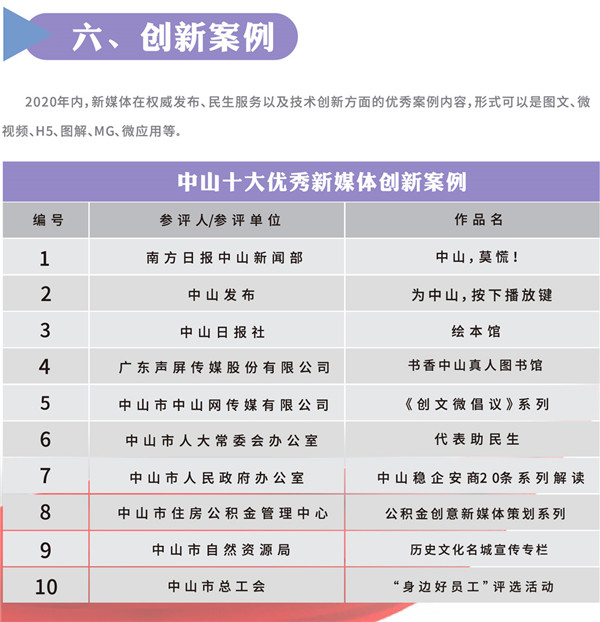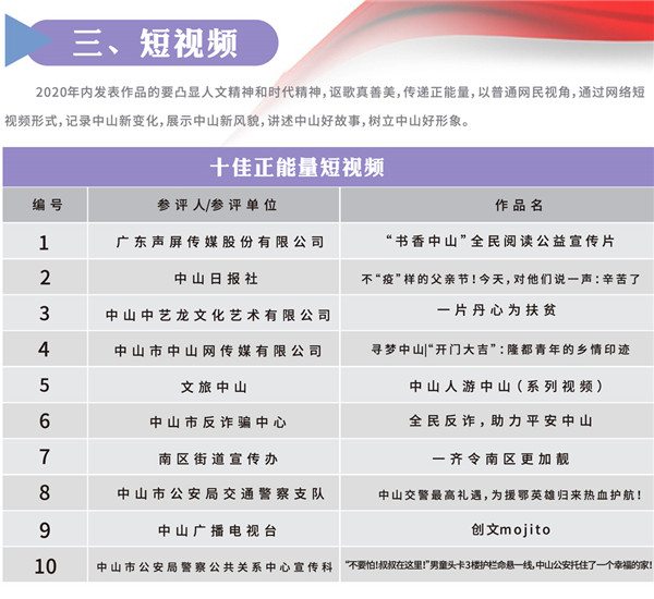 本次榜單共設(shè)置中山十大最具影響力政務(wù)新媒體(微信)、十大鎮(zhèn)區(qū)新銳政務(wù)新媒體(微信)、年度中山十佳網(wǎng)絡(luò)短視頻、年度十佳最具行業(yè)影響力微信公眾號(hào)、年度中山新銳視頻號(hào)(抖音與微信視頻號(hào))、年度十大優(yōu)秀新媒體創(chuàng)新案例、中山優(yōu)秀新媒體編輯、年度中山十大優(yōu)秀網(wǎng)絡(luò)直播案例、年度優(yōu)秀網(wǎng)絡(luò)主播等獎(jiǎng)項(xiàng),對(duì)2020年度中山市優(yōu)秀網(wǎng)絡(luò)作品進(jìn)行頒獎(jiǎng),同時(shí)還邀請(qǐng)專家進(jìn)行短視頻創(chuàng)作課題或大數(shù)據(jù)與新媒體傳播內(nèi)容分享。
