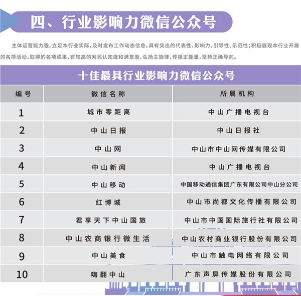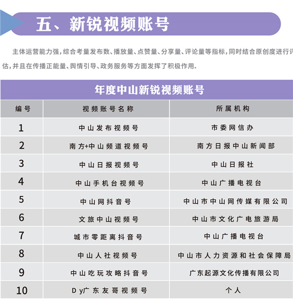 經(jīng)過(guò)多年的探索和資源整合,中山新媒體影響力年度榜單評(píng)選影響力不斷擴(kuò)大。今年根據(jù)新媒體發(fā)展變化,增加了音頻、視頻號(hào)等評(píng)選項(xiàng)目,獎(jiǎng)項(xiàng)設(shè)置更有針對(duì)性、權(quán)威性。此次榜單發(fā)布是我市網(wǎng)絡(luò)文化發(fā)展成果的集中展示與檢閱,上榜新媒體、優(yōu)秀作品、創(chuàng)新案例與先鋒人物是我市網(wǎng)絡(luò)文化發(fā)展的標(biāo)桿和典范,它們的探索和創(chuàng)新為我市網(wǎng)絡(luò)文化百花齊發(fā)、健康向上發(fā)展做出了貢獻(xiàn)。