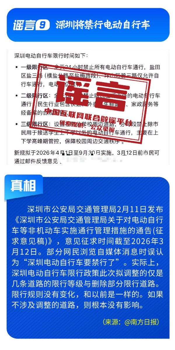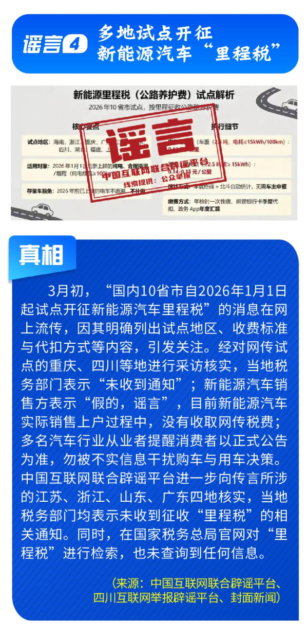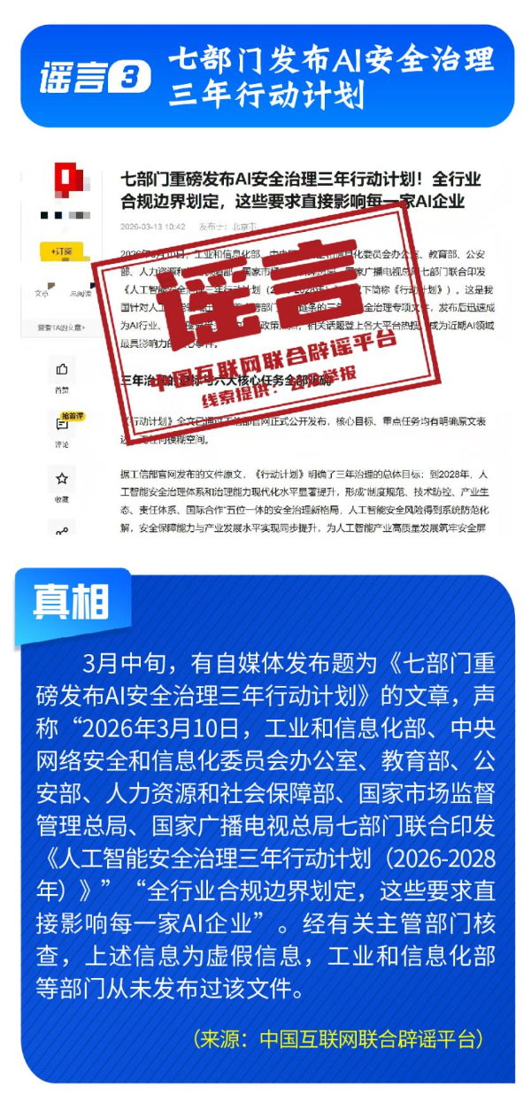 偽造政策文件,擾亂市場預期。《七部門重磅發(fā)布AI安全治理三年行動計劃》完全是自媒體憑空杜撰,工信部等部門公開表示并無相關(guān)文件;“科大訊飛向政府備案裁員30%”系網(wǎng)民為博關(guān)注而捏造;“農(nóng)業(yè)銀行”發(fā)送高額貸款短信實為營銷號冒名發(fā)送,并非銀行官方行為;“深圳將禁行電動自行車”是對管理措施征求意見稿的誤讀;“多地試點開征新能源汽車‘里程稅’”則列舉虛假試點地區(qū)與收費標準,已被多地稅務部門明確予以否認。