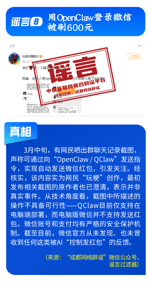 曲解專業(yè)信息,引發(fā)公眾焦慮。“應縣木塔即將全部拆卸落地大修”信息,未全面科學看待應縣木塔維修保護工作,產(chǎn)生誤讀誤解,相關(guān)不實信息極易引發(fā)不必要的文物保護擔憂;“超強厄爾尼諾將致最熱年”的片面斷言,刻意混淆“拉尼娜狀態(tài)”與“拉尼娜事件”等科學概念,引發(fā)公眾焦慮;“電網(wǎng)公司蓄意調(diào)快電表”的舊謠與“安裝節(jié)電器可立省50%”的新騙局捆綁出現(xiàn),所謂“節(jié)電器”不僅自身耗電,還存在極大安全隱患。而謠言“用OpenClaw登錄微信被刷走600塊”實為網(wǎng)民借熱點“玩?!背醋?,引發(fā)公眾對網(wǎng)絡支付安全的恐慌心理。