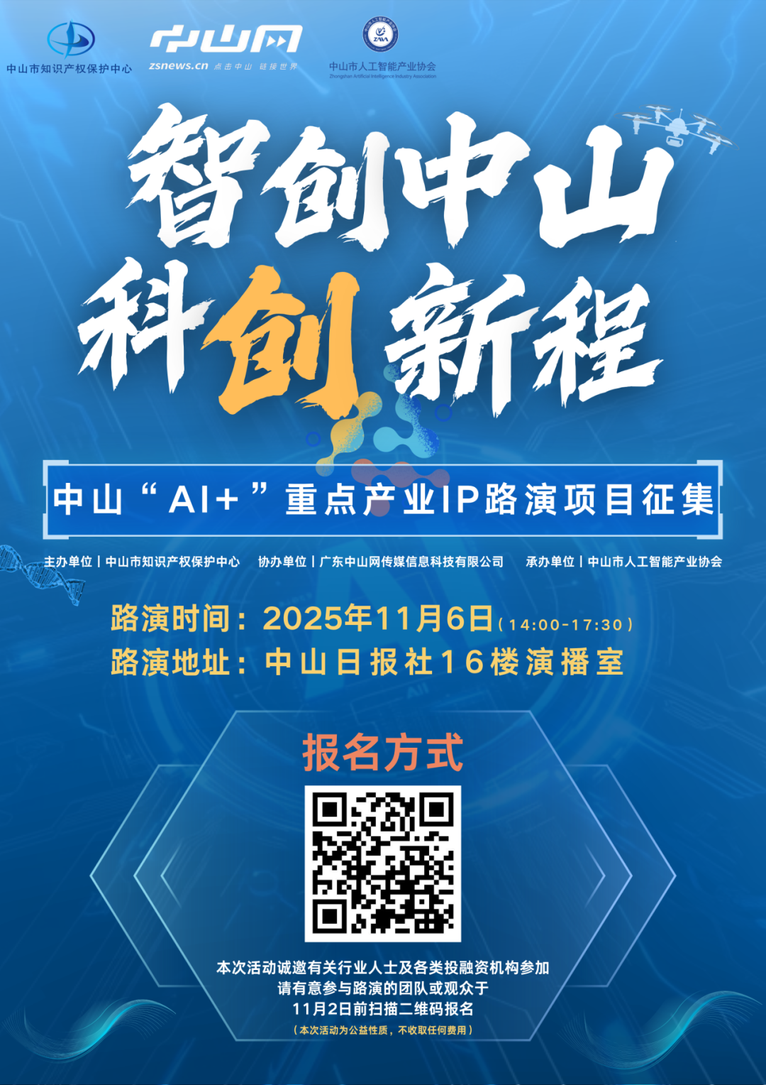 本次活動(dòng)誠邀有關(guān)行業(yè)人士及各類投融資機(jī)構(gòu)參加,請(qǐng)有意參與路演的團(tuán)隊(duì)或觀眾,于11月2日前掃描以下二維碼報(bào)名。本次活動(dòng)為公益性質(zhì),不收取任何費(fèi)用。