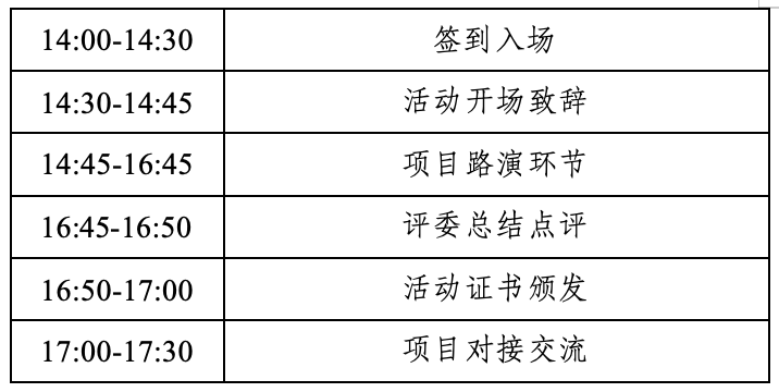 (五)活動(dòng)形式:采用線下路演模式,每個(gè)項(xiàng)目路演時(shí)長20分鐘以內(nèi)(含15分鐘項(xiàng)目展示+5分鐘評(píng)委提問環(huán)節(jié))。